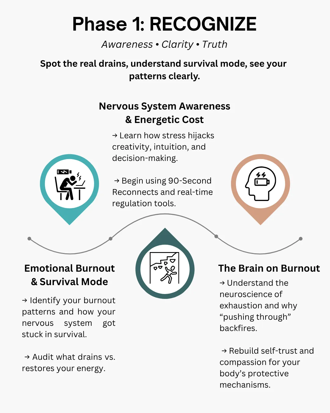 While other programs focus on productivity hacks or surface-level mindset work, this method rewires your nervous system at the cellular level. When your body feels safe, your mind can access creativity and strategic thinking again.