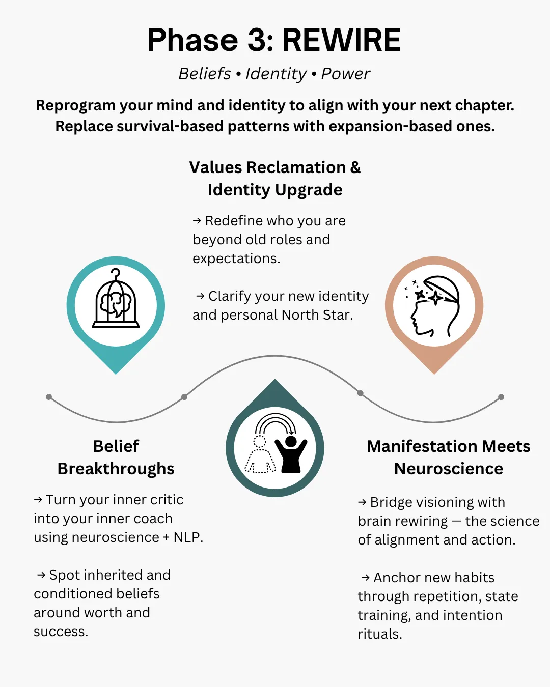My coaching methodology integrates neuroscience, trauma psychology, mindfulness, and NLP, providing a powerful framework that bridges brain science with soul work—empowering others to rebuild from the inside out. As the founder of transformational coaching programs, I specialize in guiding individuals through their most challenging moments, helping them emerge with clarity, purpose, and actionable steps for lasting transformation.